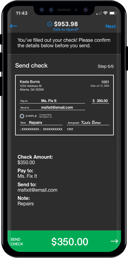 7) Preview and Send: Here we give users a final preview of the check, with each input called out below as well. This allows users to be absolutely sure that they filled out each field correctly. When ready, on tap CTA triggers send check and brings user to confirmation page.